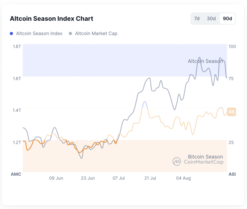 The Altcoin Season Index is reading a score of 46 out of 100 at the time of publication. Source: CoinMarketCap