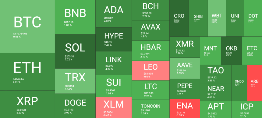 HYPE, SOL, and OKB follow suit in terms of daily gains, but are far behind with 8%, 7%, and 5%, respectively. ETH, XRP, BNB, DOGE, ADA, and LINK are also well in the green.