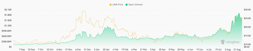 Data from CoinGlass shows a sharp surge in activity. LINK derivatives volume rose more than 114% to $5.82 billion. However, open interest actually decreased slightly by 5.69% to $1.52 billion.