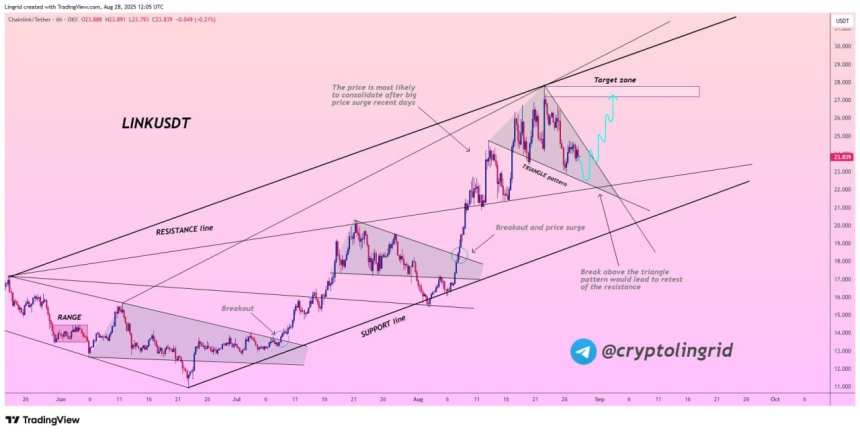 From a technical perspective, analyst Lingrid stated that LINK is locked in a tight triangle formation after its previous major rally. The price structure remains biased toward trend continuation, especially if buyers successfully reclaim the last breakdown line and establish it as new support.