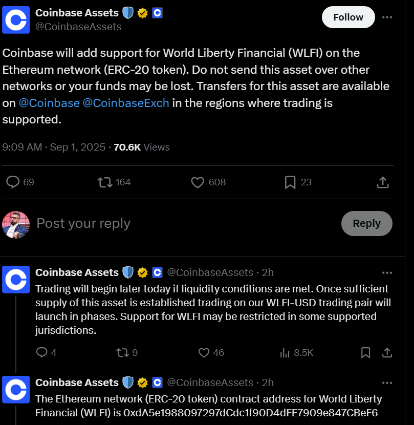 Separately, Coinbase announced it will support WLFI on the Ethereum network, with trading to begin once “liquidity conditions are met.”