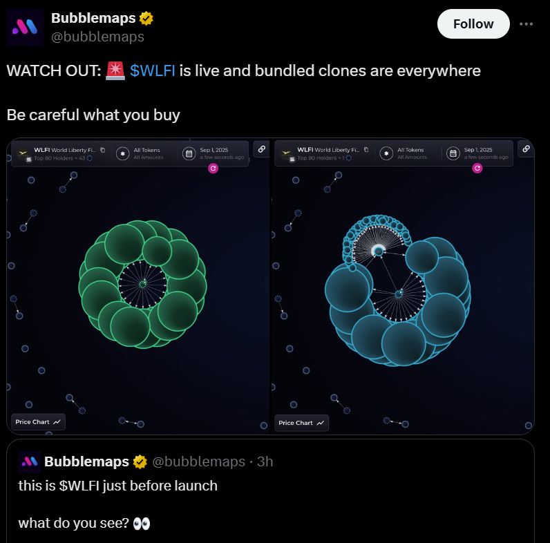 Alongside the hype, numerous WLFI scams have appeared. Analytics firm Bubblemaps identified “bundled clones” — look-alike smart contracts that imitate established crypto projects. Using the wrong contract address could result in a permanent loss of funds.