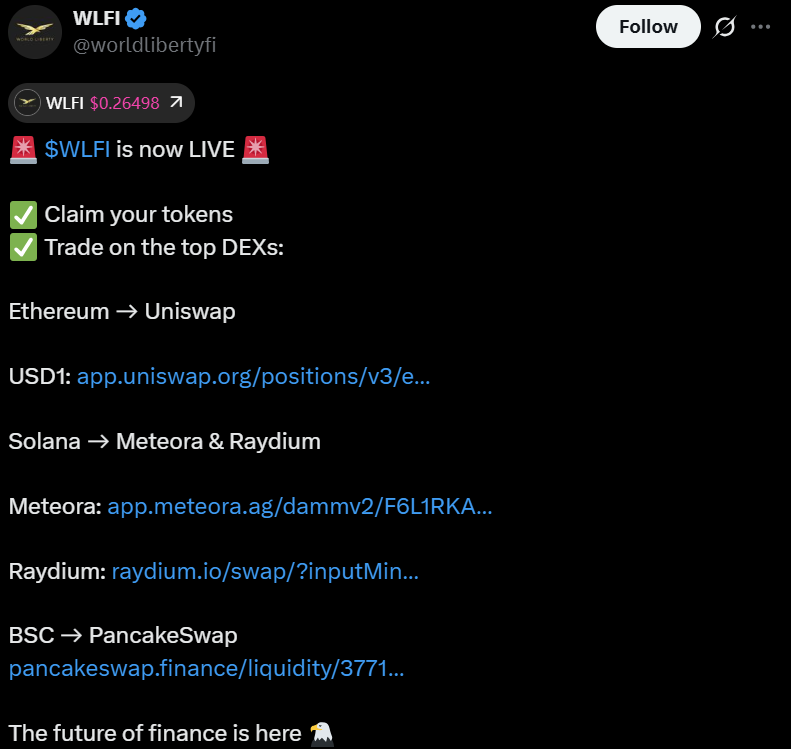 Binance became the first major exchange to list WLFI, offering trading pairs with USDC and USDT. Trading has also gone live on Bybit, Bitget and KuCoin.