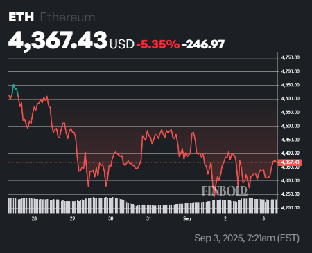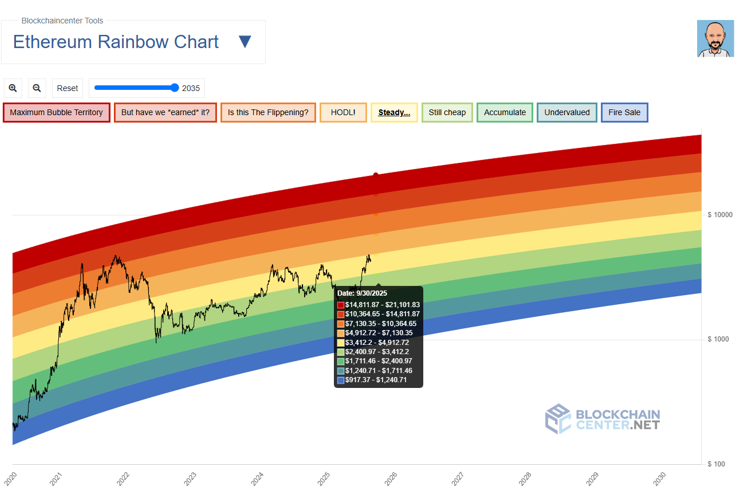 Currently, Ethereum is trading at $4,380, placing it in the ‘Steady’band of the Rainbow Chart. This suggests that if the cryptocurrency maintains its current positioning relative to the model, it could remain within the Steady or HODL range by the end of September 2025.
