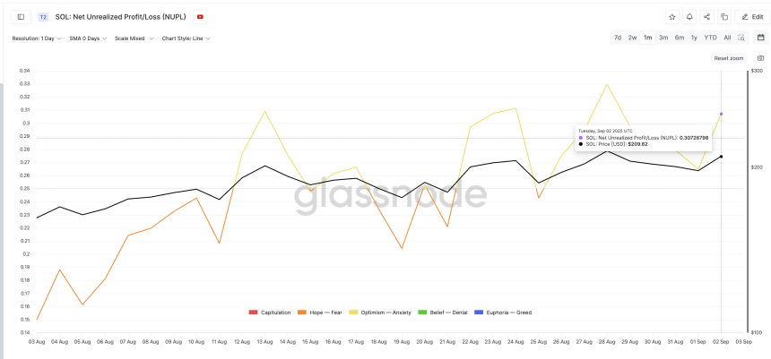 Over the past day, Solanas NUPL has climbed about 15.4%, moving from 0.26 to 0.30 and forming another local peak. Previous peaks have consistently aligned with corrections. On August 28, when NUPL topped out, Solana slipped from $214 to $205 — a drop of 4.2%. Earlier, on August 13, NUPL reached 0.30, and prices corrected by almost 8%.
