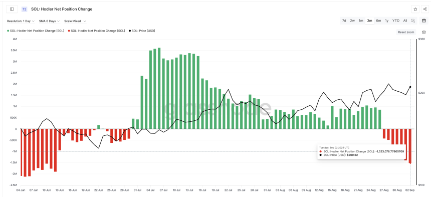 At present, Solanas Hodler Net Position Change has dropped sharply into the red, crossing below –1.5 million SOL. This shows long-term investors are reducing exposure even as prices trend higher — a bearish divergence.