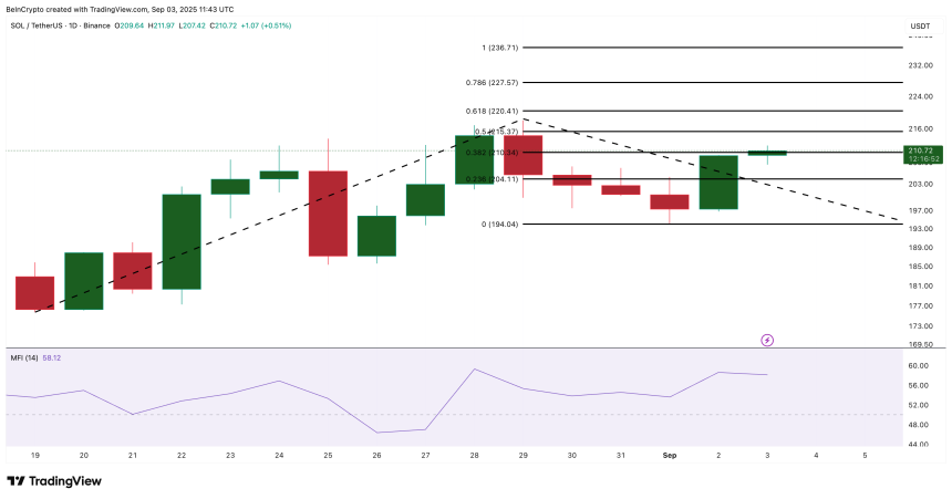 The Money Flow Index (MFI) — which measures inflows and outflows of capital relative to price — adds another cautionary sign. Although MFI climbed alongside Solana‘s current price bounce, it has since trended lower as the price pulled back. This divergence suggests weaker dip buying: new money isn’t flowing in aggressively to support higher prices.