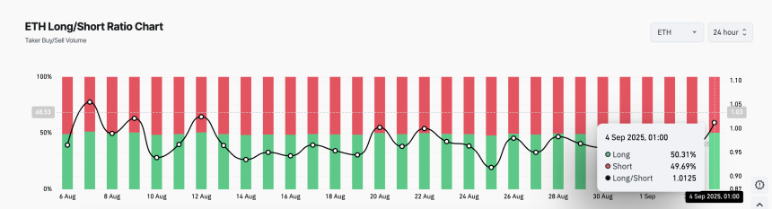 Moreover, Coinglass data shows a rise in ETHs long/short ratio, indicating a stronger bullish tilt in sentiment among futures traders. At press time, this stands at 1.01.