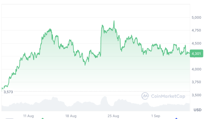 Ether has dipped slightly over the past seven days, down 2.92%, trading at $4,301 at the time of publication, according to CoinMarketCap.