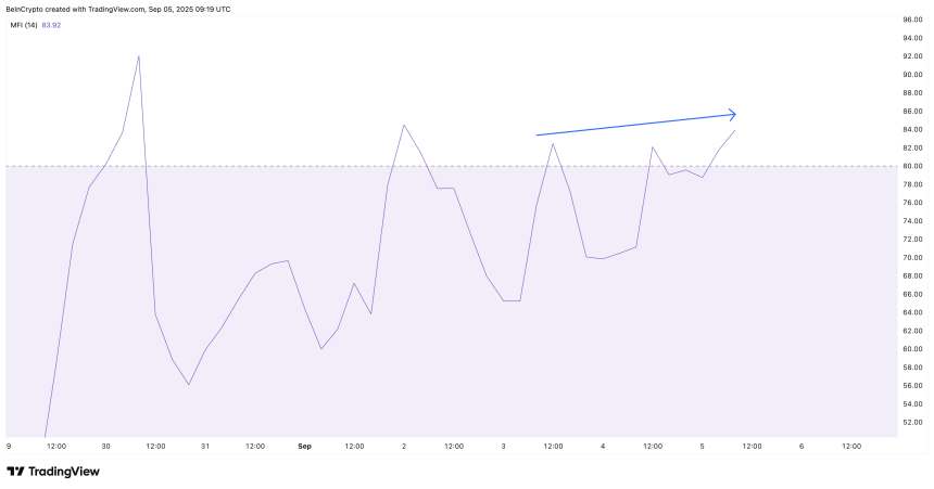 The Money Flow Index (MFI), which combines price and volume to show whether money is flowing in or out, is also flashing strength. On the 4-hour chart, MFI has pushed above 80 and is making higher highs alongside price.