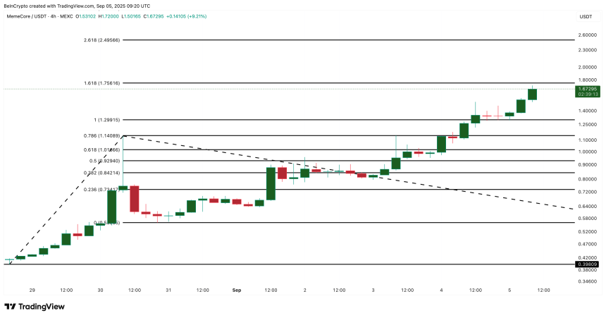At press time, MemeCore trades at $1.67. The first major resistance is $1.75 based on the MemeCore price discovery targets.