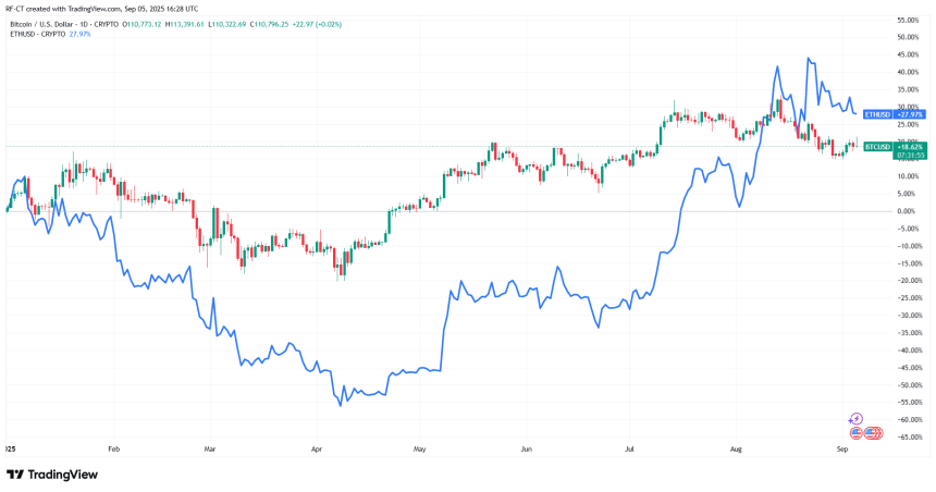 By TradingView - BTCUSD vs ETHUSD_2025-09-05 (YTD)
