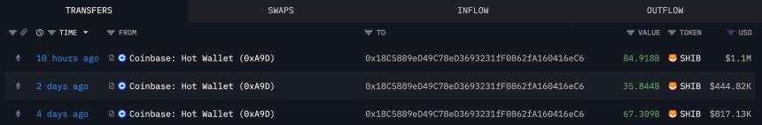In the meantime, another Coinbase-linked wallet has been taking on tokens during the same period. Just four days ago, it added 67.3 billion SHIB worth $817,000, followed by 35.8 billion SHIB worth $444,820, and then a whopping 84.9 billion tokens worth $1.1 million in just one transfer.