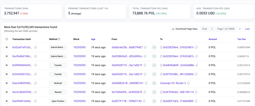 Transactions on Polyscan, the block explorer for Polygon, are displaying properly. Source: Polygon Scan