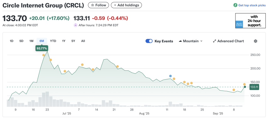 However, despite this momentum, Bullish shares currently trade at $53.9, down 43.58% from their August listing price. Circle Internet Group shares have climbed 93.7% from their June listing, dropping from a mid-June peak of $263 to as low as $112 before recovering to about $132.