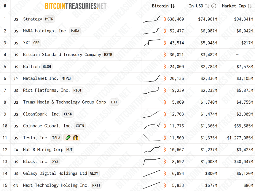 Top 15 Bitcoin treasury firms. Source: BitcoinTreasuries.NET