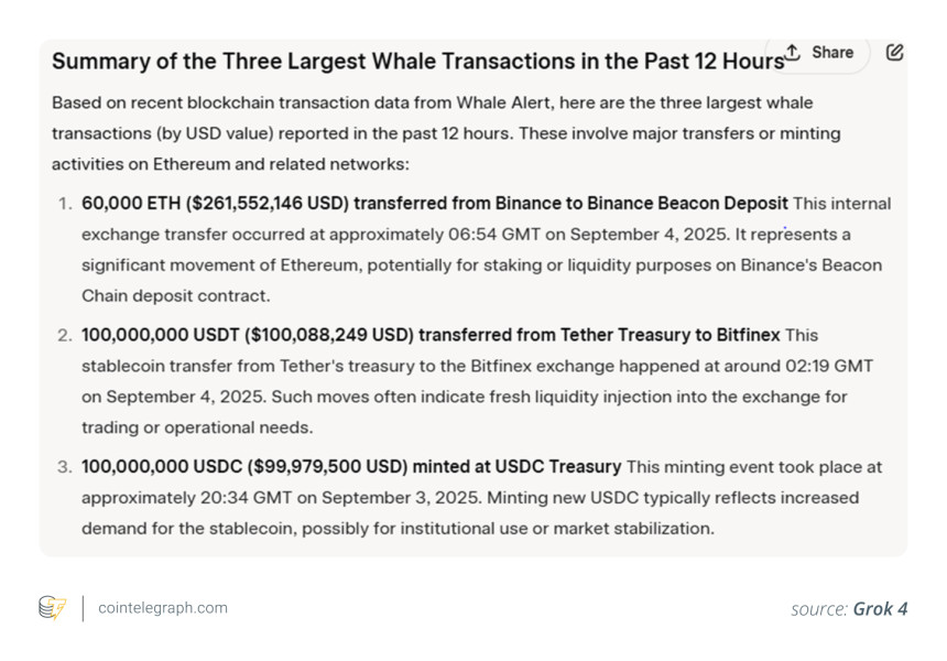 Grok 4 use case:Connect Whale Alert feeds to Grok, then ask it to contextualize moves against market chatter.