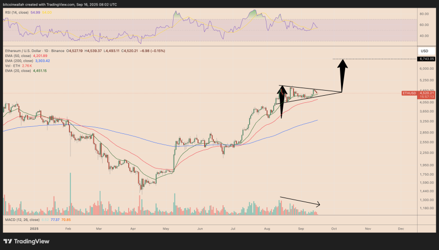 The chart pattern projects a move toward $6,750 by October, more than 45% above current levels, if ETH closes decisively above the pennants upper trendline.