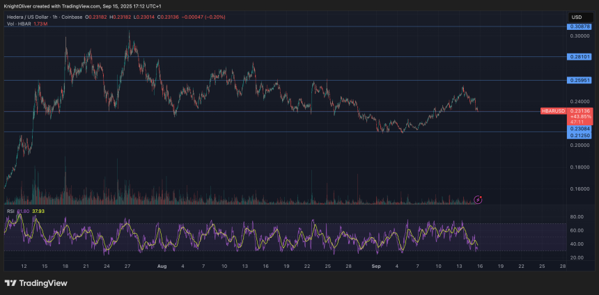 Hedera Hashgraph‘s HBAR token endured steep losses over a volatile 24-hour window between September 14 and 15, falling 5% from $0.24 to $0.23. The token’s trading range expanded by $0.01 — a move often linked to outsized institutional activity — as heavy corporate selling overwhelmed support levels. The sharpest move came between 07:00 and 08:00 UTC on September 15, when concentrated liquidation drove prices lower after days of resistance around $0.24.