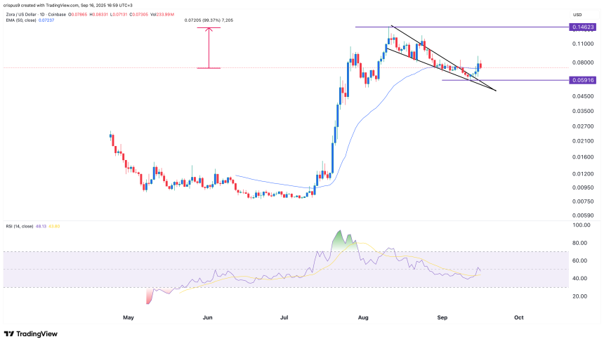 The daily time frame chart shows that the Zora price recently pulled back and bottomed at $0.0591 last week. It has formed a bullish falling-wedge pattern, which is characterized by two descending, converging trendlines.