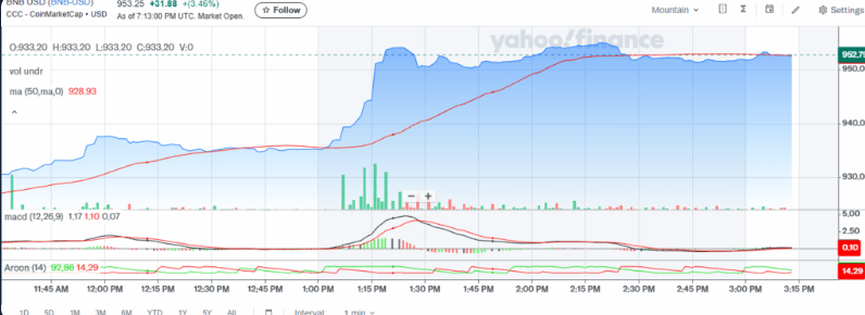 The token stair-stepped higher and then ranged under session highs near 953–954. Price stayed well above the 50-period average around 929, while MACD compressed. Aroon Up remained above Aroon Down, which signaled trend control with buyers.