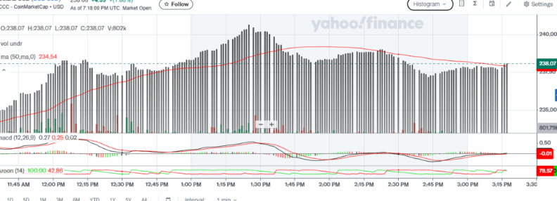 SOL rode an intraday uptrend and held above its 50-period average near 234.5. Volume peaked near the days high and then eased into balance. MACD flattened around zero while Aroon Up stayed stronger than Aroon Down.