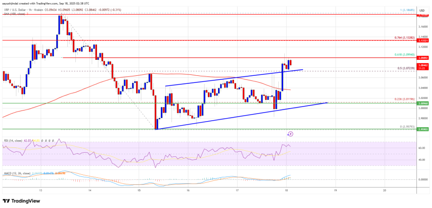 XRP price started a fresh increase above the $3.020 resistance. The price is now showing positive signs and might gain pace if it clears the $3.120 zone.