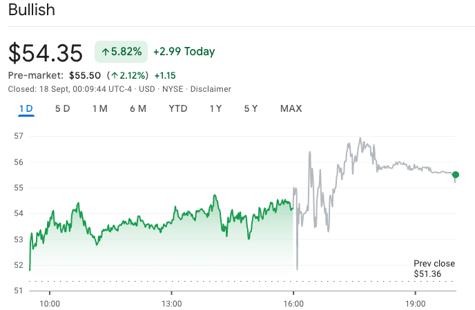 Bullish (BLSH) shares ended after-hours trading at 2.1% at $55.50, boosted by its earnings beat.