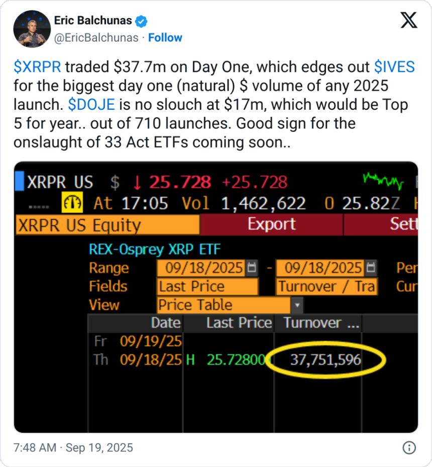 The REX-Osprey XRP ETF (XRPR), which tracks XRP, saw $37.7 million in volume, according to data from Balchunas and Cboe.