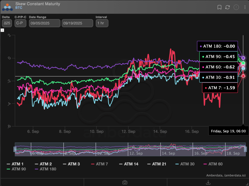 BTC options skew is negative across all time frames. (Amberdata/Deribit)