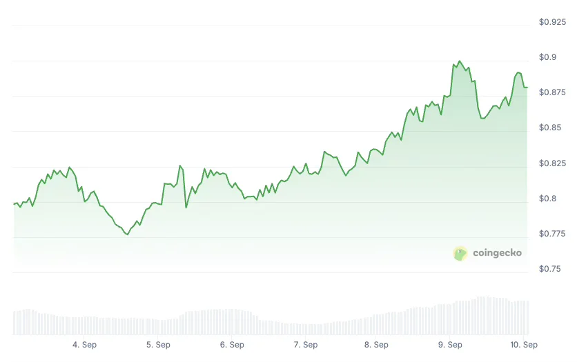 TWT rebounded off long-term support at $0.72, held since June 2023. On the daily chart, the token cleared an inverse head-and-shoulders neckline at $0.89, confirming reversal structure.