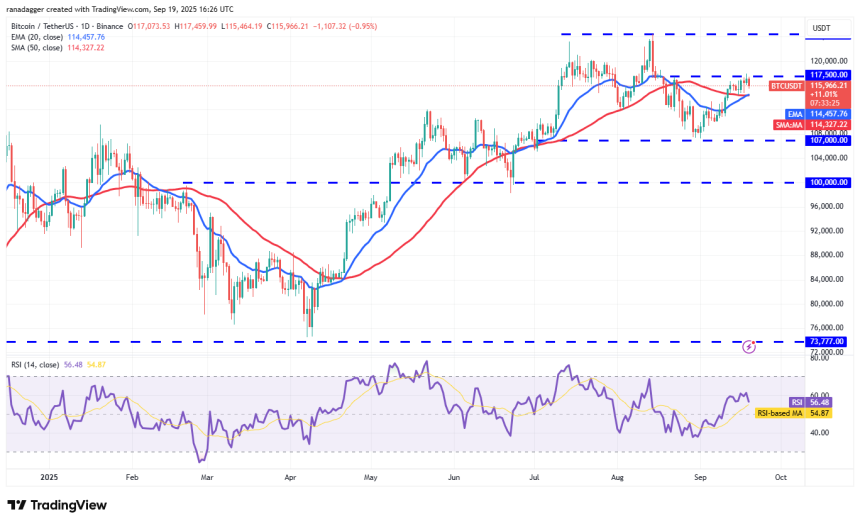 Bitcoin (BTC) continues to face significant resistance near $117,500, but a positive sign is that the bulls have kept up the pressure. That suggests the buyers are not rushing to the exit as they anticipate a move toward the all-time high of $124,474.