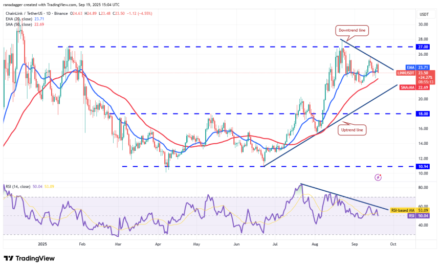 Chainlink (LINK) turned up from the 50-day SMA ($22.69) on Wednesday, but the bulls are facing stiff resistance at the downtrend line.