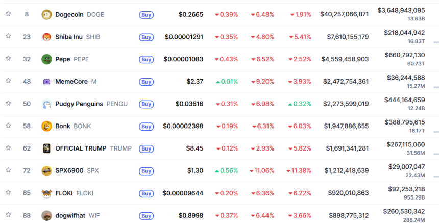 The top 10 memecoins have all declined in the last 24 hours. Dogecoin slid 6.6%, Shiba Inu is down 4%, PEPE is down 5.6%, Meme core is down 11.5%, PUDGY dipped by 8.2%, BONK notched a decline of 5.7%, and TRUMP has dropped 2.8%. Collectively, the meme market shed 6.37% over the past day, shrinking to $77.09 billion.
