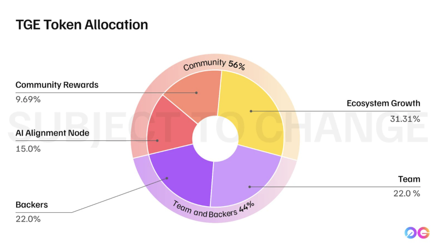 The remaining allocation is split between 31.31% for Ecosystem Growth, and 15% for AI Alignment Nodes, which are the special nodes that secure the network and ensure that AI agents within the ecosystem remain aligned with human oversight and application-specific constraints.