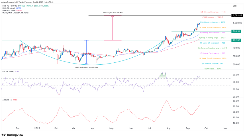 Binance Coin (BNB) has surged past the $1,000 mark this week, extending its strong rally fueled by r