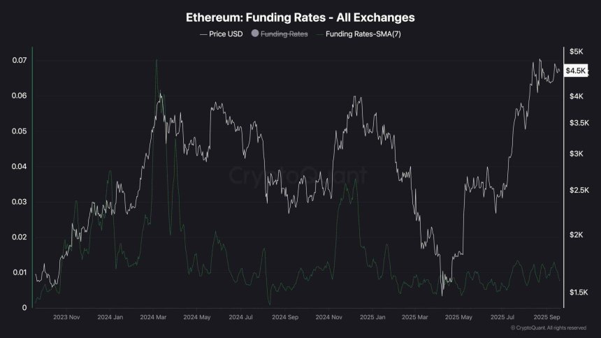 Moving away from technical analysis, this chart presents the 7-day moving average of Etheremus funding rates. The funding rates metric measures how aggressive the buyers and the sellers are in the futures market, with positive values indicating more aggressive position-taking by the buyers.