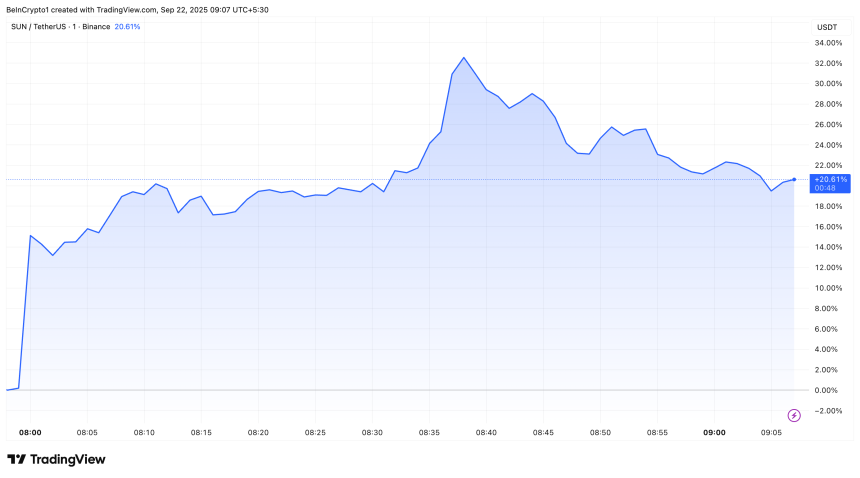 SUN surged 36% from $0.025 to $0.034. It moderated to $0.030 at press time, up more than 20% since the announcement.