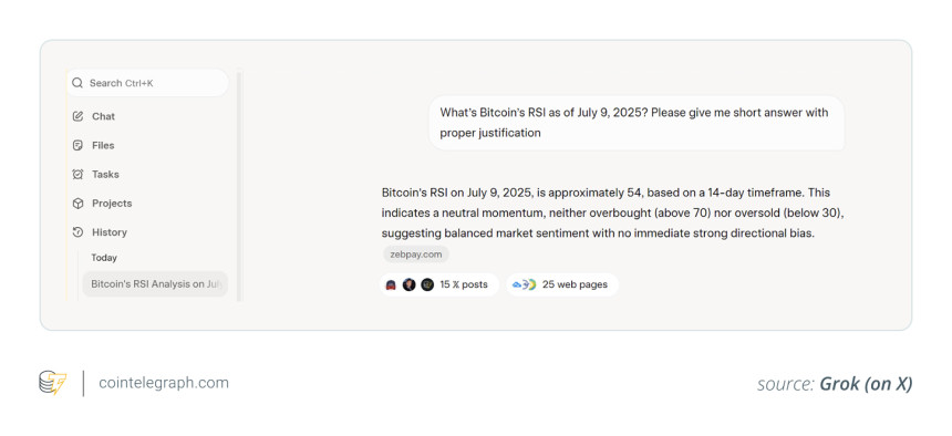 According to Grok, Bitcoins RSI is 54 on July 9, 2025, using a 14-day timeframe, indicating neutral momentum (see image below).