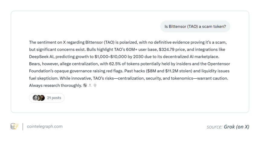 Based on the above prompt, Grok reports mixed X sentiment on Bittensor (TAO): bulls see $1,000–$10,000 potential by 2030 for its AI marketplace, but bears highlight centralization, insider token control, hacks, and governance issues, urging caution.