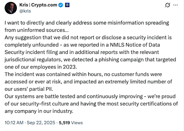 Crypto.com CEO Kris Marszalek says the exchange had disclosed a 2023 security breach to regulators, and accusations suggesting otherwise were misinformation.