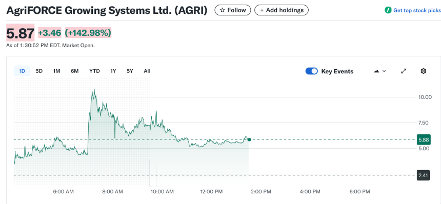 AgriFORCE intraday performance. Source: Yahoo Finance