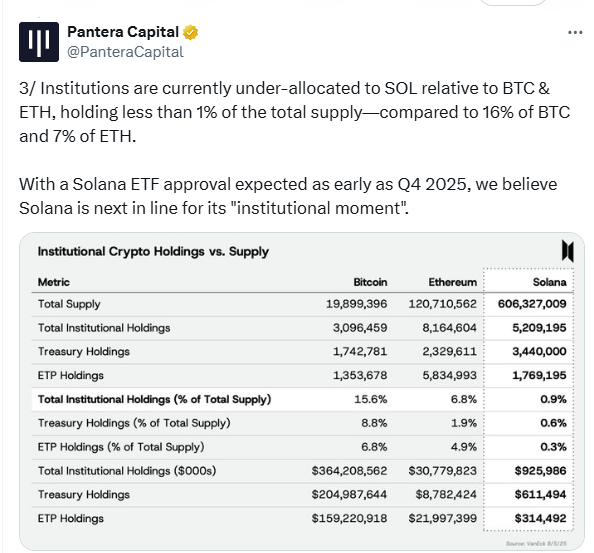 “Institutions are currently under-allocated to SOL relative to BTC & ETH, holding less than 1% of the total supply—compared to 16% of BTC and 7% of ETH,” Pantera stated in its Sept. 18 post.