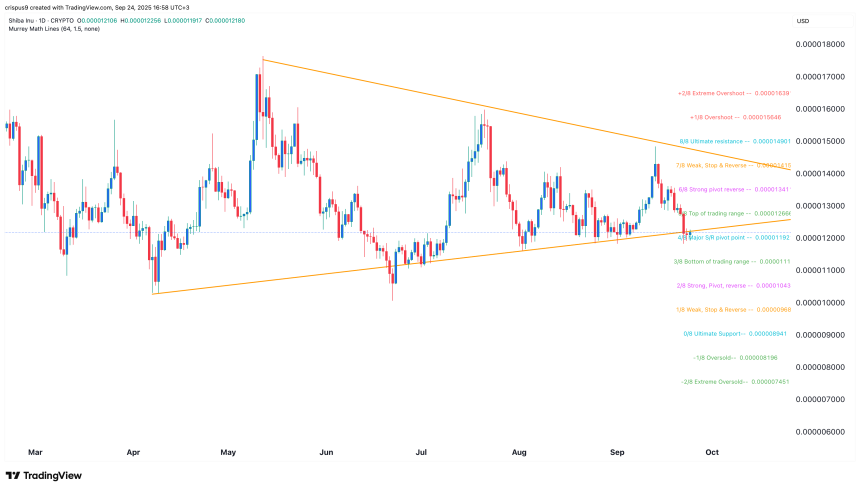 Technical analysis suggests that the SHIB price could rebound soon, as it has crashed to a critical support level. This support is part of the lower side of the symmetrical triangle pattern, whose two lines are nearing their confluence level.