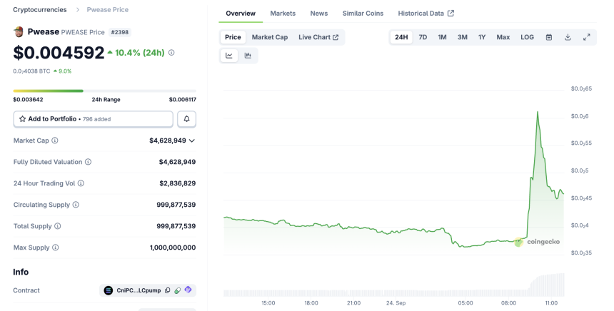 PWEASE Price Performance. Source: CoinGecko