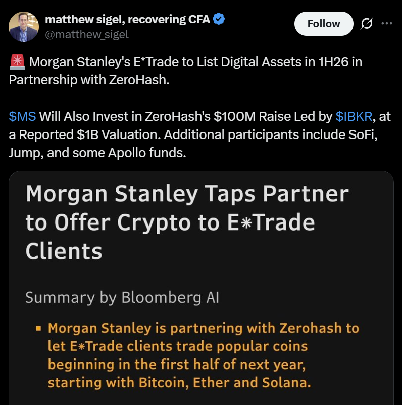 A Morgan Stanley spokesperson confirmed to Reuters that E*Trade clients will soon be able to buy Bitcoin (BTC), Ether (ETH) and Solana (SOL), aligning with earlier reports about the banks crypto push.