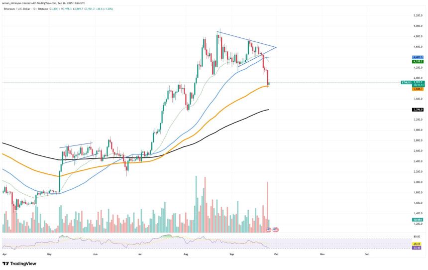 After falling below $4,000 and currently testing the $3,800 mark — which is precisely in line with the 100-day Exponential Moving Average — Ethereum has entered a critical phase. Before a more significant retracement occurs, this area is beginning to take shape as ETH's final significant line of defense. After ETH failed to hold above the $4,600-$4,800 resistance zone, where a symmetrical triangle breakdown validated bearish momentum, it has been under constant sell pressure for the last two weeks.