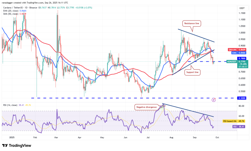 Buyers are trying to push the price back above $0.78 but may face significant selling from the bears at the current level and on any rise toward the 20-day EMA ($0.84). If the price turns down sharply from the 20-day EMA, the ADA/USDT pair could nosedive to the next strong support at $0.68.