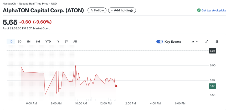 In a press release, the company said it plans to build its treasury to $100 million in TON by the end of 2025. AlphaTON shares were down about 9.6% over 24 hours at the time of writing, according to Yahoo Finance.