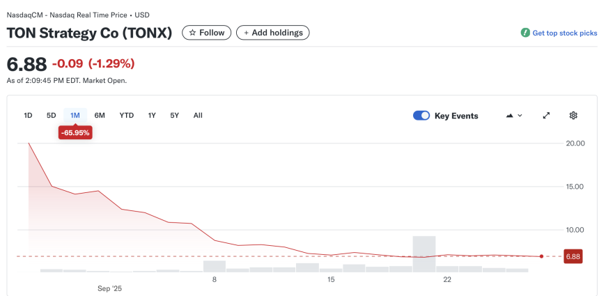 TON Strategy, the first TON treasury company to launch, began accumulating in August with a purchase of $713 million, and now holds around 217.5 million tokens. Its stock performance has also struggled, falling over 65% in the past month.